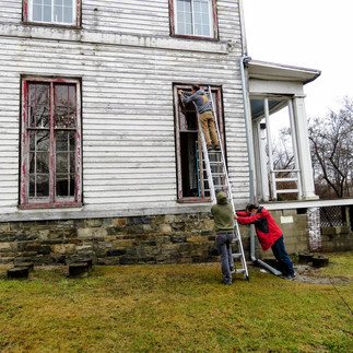 Fortunately, panes have survived. Kurt Riegel and his assistant Ben provided exciting insights to the likely maker of the Harmony Hall windows and mechanical parts. Given the irregular dovetail joints, it is thought the windows were made on-site by a local jointer. Conical screws, which were used to encase the window's weight mechanism behind the right and left of the window's thin vertical panel, are hand-made! This is an interesting evaluation, as the builder of Harmony Hall, Jacob Sloat, held several patents as an inventor and mill owner. A lengthy article on Jacob, in a periodical precursor to the Wall Street Journal, described Jacob as a mechanical genius and refers to his involvement with the development of an early conical screw. Two pieces of original twisted hemp sash cord are also intriguing finds, given that Jacob ran a mill in Sloatsburg known for a successful twine product that rivaled his competitors in the NYC market for many years. Thus, it is plausible that Jacob may have manufactured window rope and other parts for the windows in his homestead at his mill located near Harmony Hall along the Ramapo River and across Old Orange Turnpike.